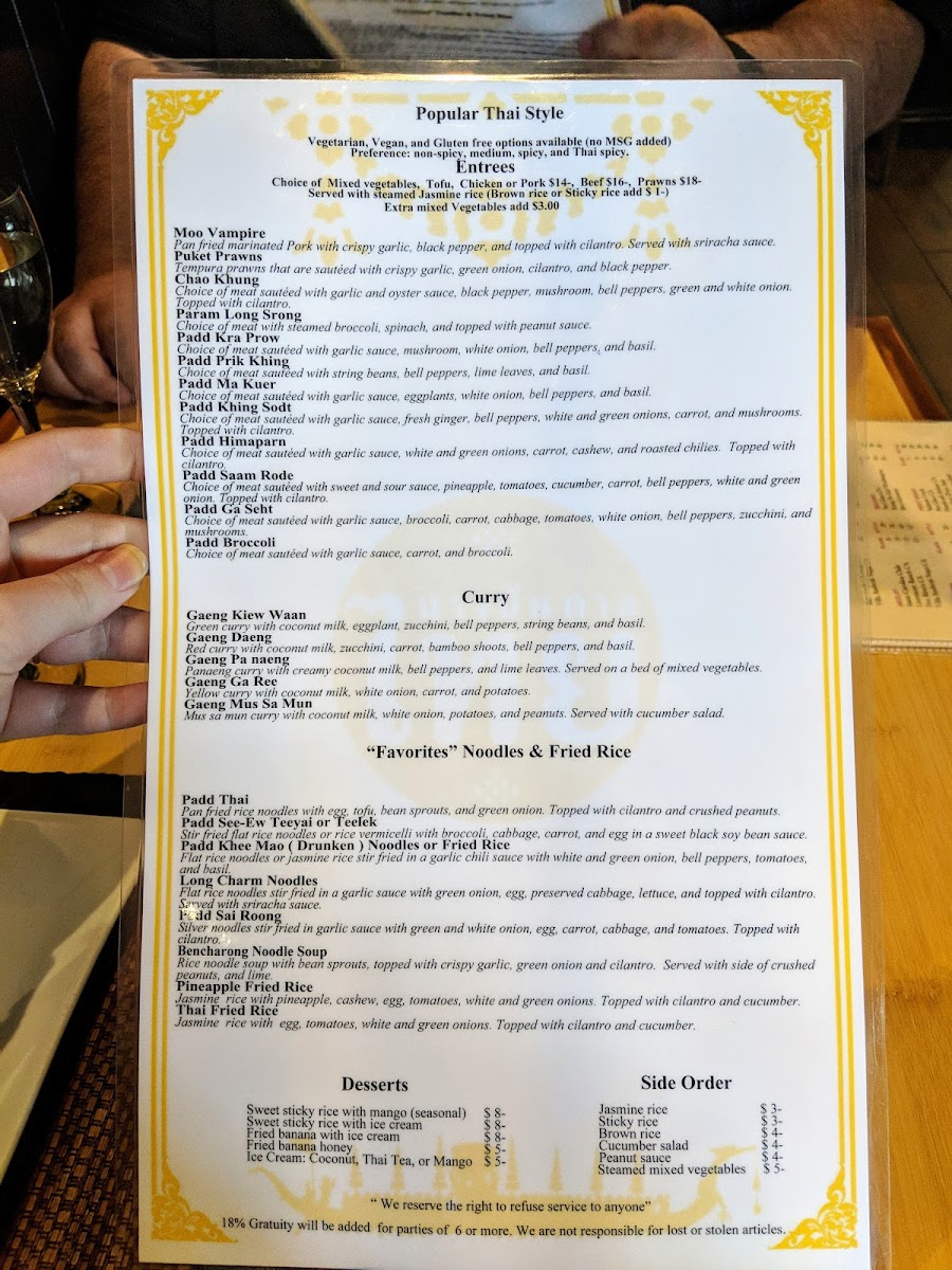 On the menu, you'll find a thoughtful mix of appetizers like fresh rolls and crab mango salad rolls, alongside hearty noodle dishes such as Drunken Noodles and Pad See Ew. Curries come in several varieties, from the aromatic Gaeng Pa Naeng to the creamy Mussaman Curry, perfect for those seeking depth and spice. Refreshing drinks like Thai Tea offer a cool, sweet contrast that fits naturally with the meal’s layers of flavor.